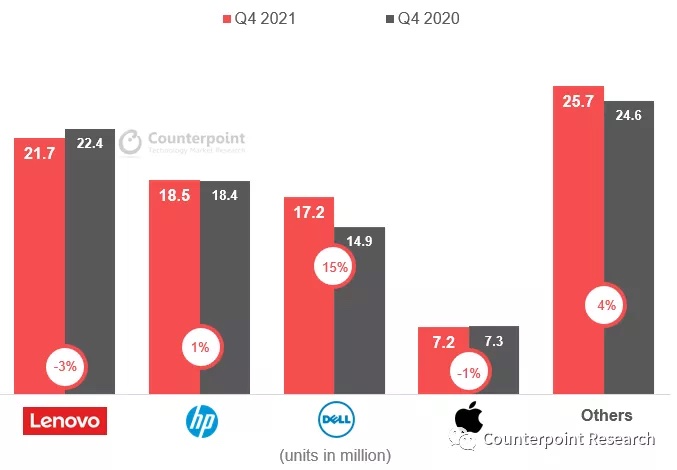 联想在 2021 年第四季度持续以 24% 的比例领跑全球 PC 商场,略低于 2020 年第四季度的比例,但仍坚持 2021 年最高的出货量,为 2170 万台。零部件缺少状况的缓解,推动了惠普以 1% 的同比增加占有了全球商场中 20.5% 的比例。得益于其商业/高端产品战略的微弱气势,戴尔在本季度完成了 15% 的同比增加。因为 M1 Macbook 的成功,Apple 在 2021 年第四季度的出货量根本坚持不变。另一方面,华硕在第四季度完成了个位数的同比增加,而宏碁则呈现了个位数的同比下降,商场比例分别为 6.8% 和 6.7%。