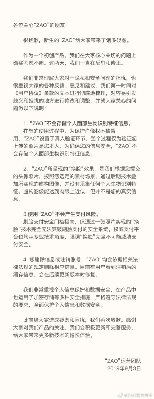 上发声明称,“作为一个草创产品,咱们在我们中心关心的问题上的确考虑不周”,并表明“十分了解我们关于隐私和安全问题的忧虑,也很注重我们的各种反应、定见和主张”。ZAO 运用称其第一时间对《用户协议》条款的文本进行了整理,一起对简单引发歧义的当地进行了修正和调整。