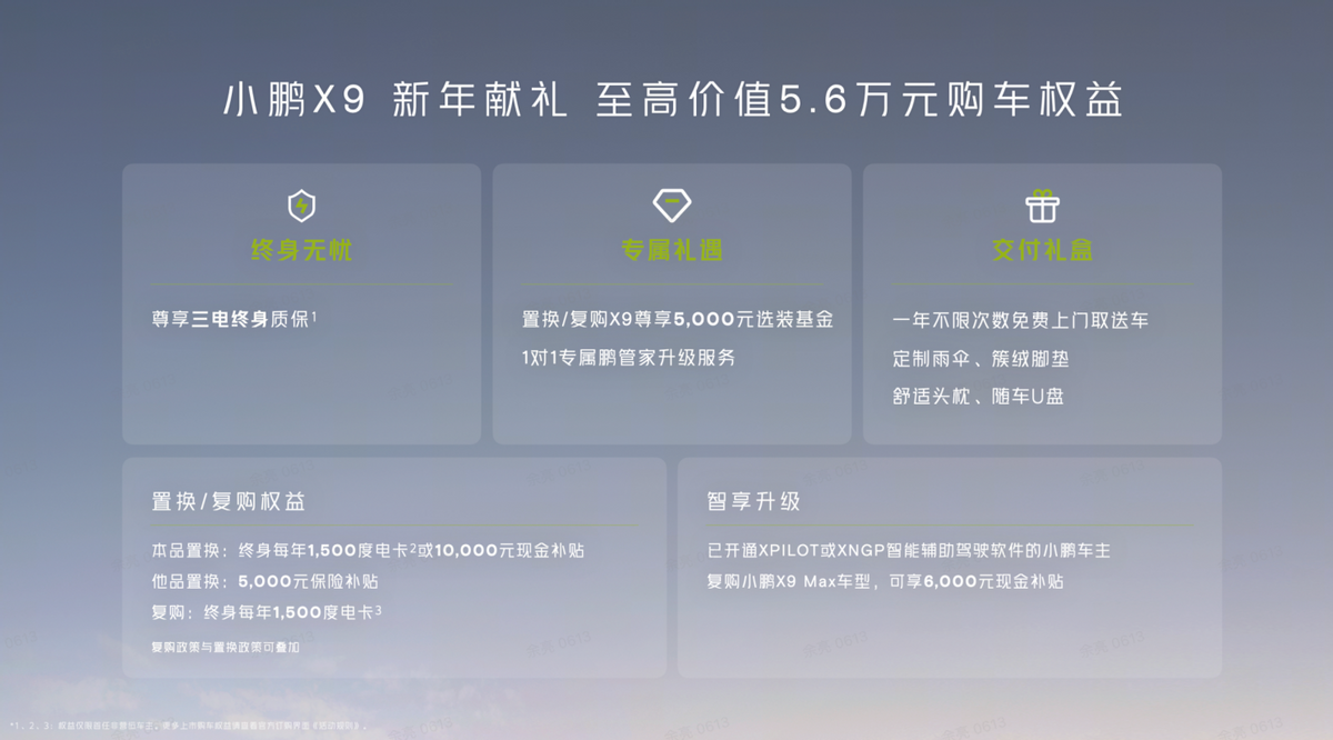 何小鹏在发布会说到,“小鹏X9牢牢确定30-40万级区间的用户中心需求,以最具价值的配备级差,下降用户挑选难度的一起,为用户供给更有用、更高性价比的挑选”。为感恩用户的继续重视与坚决挑选,小鹏X9还推出新年献礼,至高价值5.6万元购车权益,包含终身无忧、专属礼遇、交给礼盒等多重礼遇。