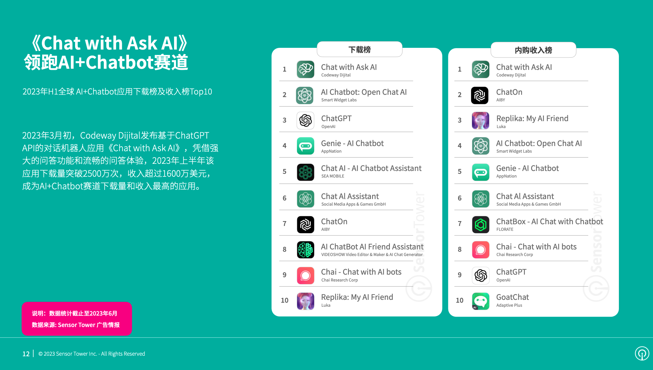 ChatGPT的发布推进AI+Chatbot赛道敏捷升温。2023年上半年,商场中AI+Chatbot运用数量多达200余款,下载量打破1.7亿次,竞赛十分激烈。《Chat with Ask AI》一经推出便敏捷取得用户喜爱,4月下载量超越1000万次。