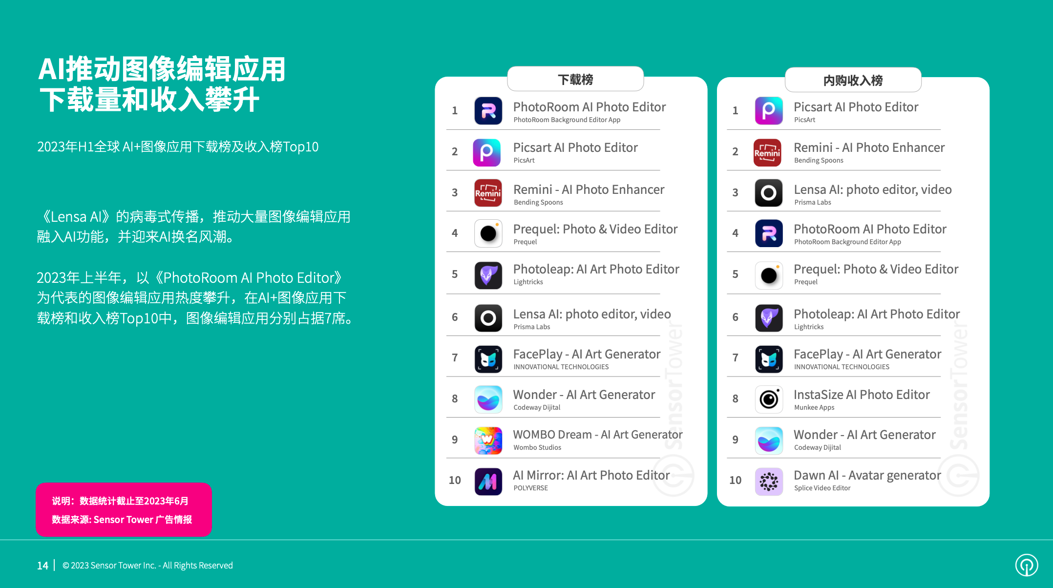 《Lensa AI》的病毒式传达,推进很多图画编辑运用热度攀升,并迎来AI换名风潮。2023年上半年,AI+图画运用下载榜和收入榜Top10中,图画编辑运用别离占有7席。